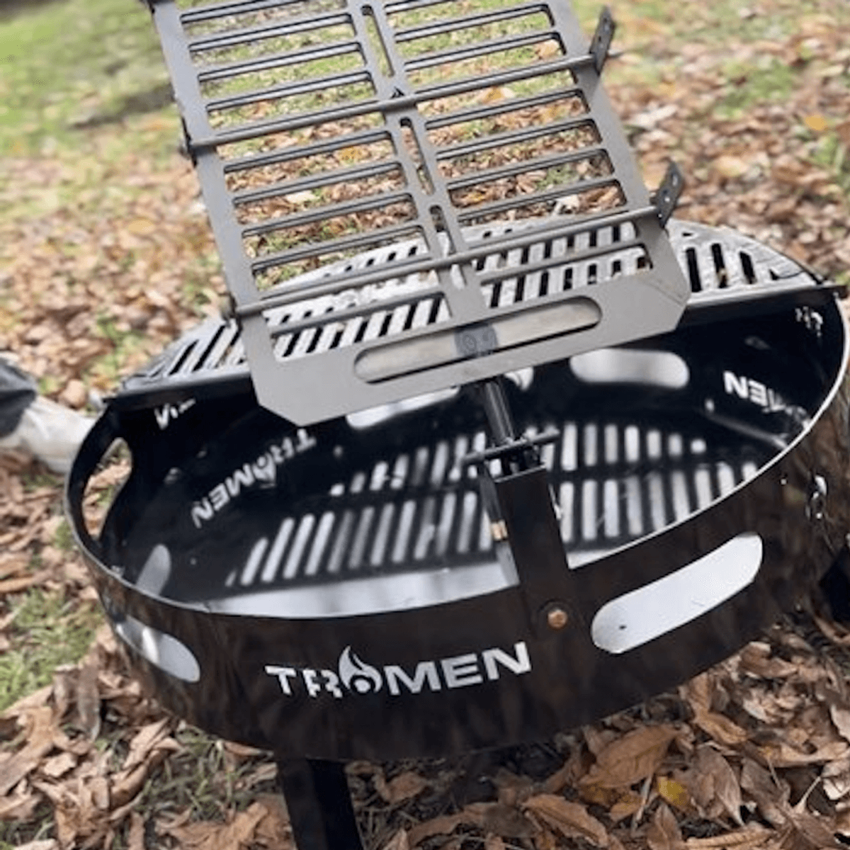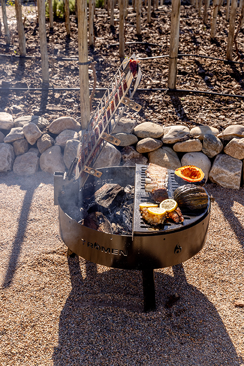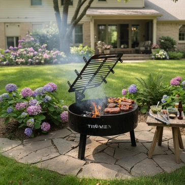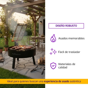 Características: Fabricada en chapa cortada con láser, con un módulo de parrilla enlozado, asador cruz regulable en altura y fogón central.