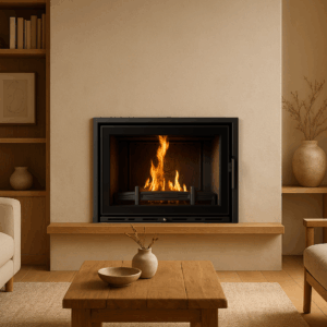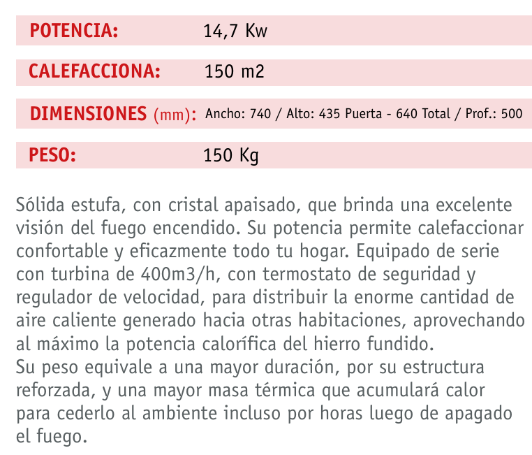 Terminación: Sólida puerta de hierro fundido, con cristal apaisado. El cuerpo de hierro fundido está protegido con una pintura para alta temperatura de un color negro grafito con muy poco brillo, lo que destaca sus líneas.