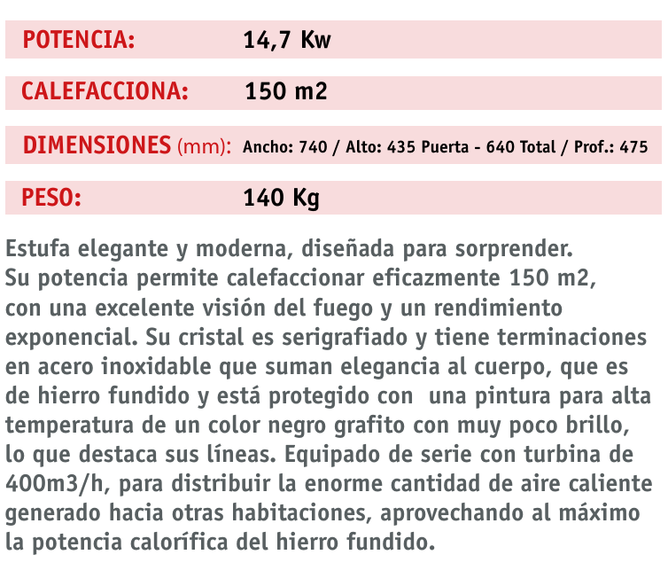 Terminación: Moderno diseño con cristal serigrafiado y terminaciones en acero inoxidable. El cuerpo de hierro fundido está protegido con una pintura para alta temperatura de un color negro grafito con muy poco brillo, lo que destaca sus líneas.